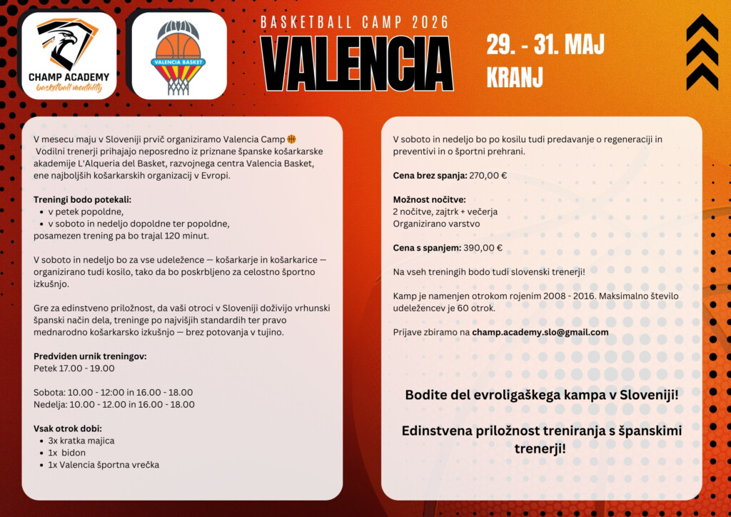 radi bi vas povabili na edinstveno priložnost v Sloveniji, saj bomo organizirali VALENCIA BASKETBALL CAMP v Kranju od 29. do 31. maja v Kranju